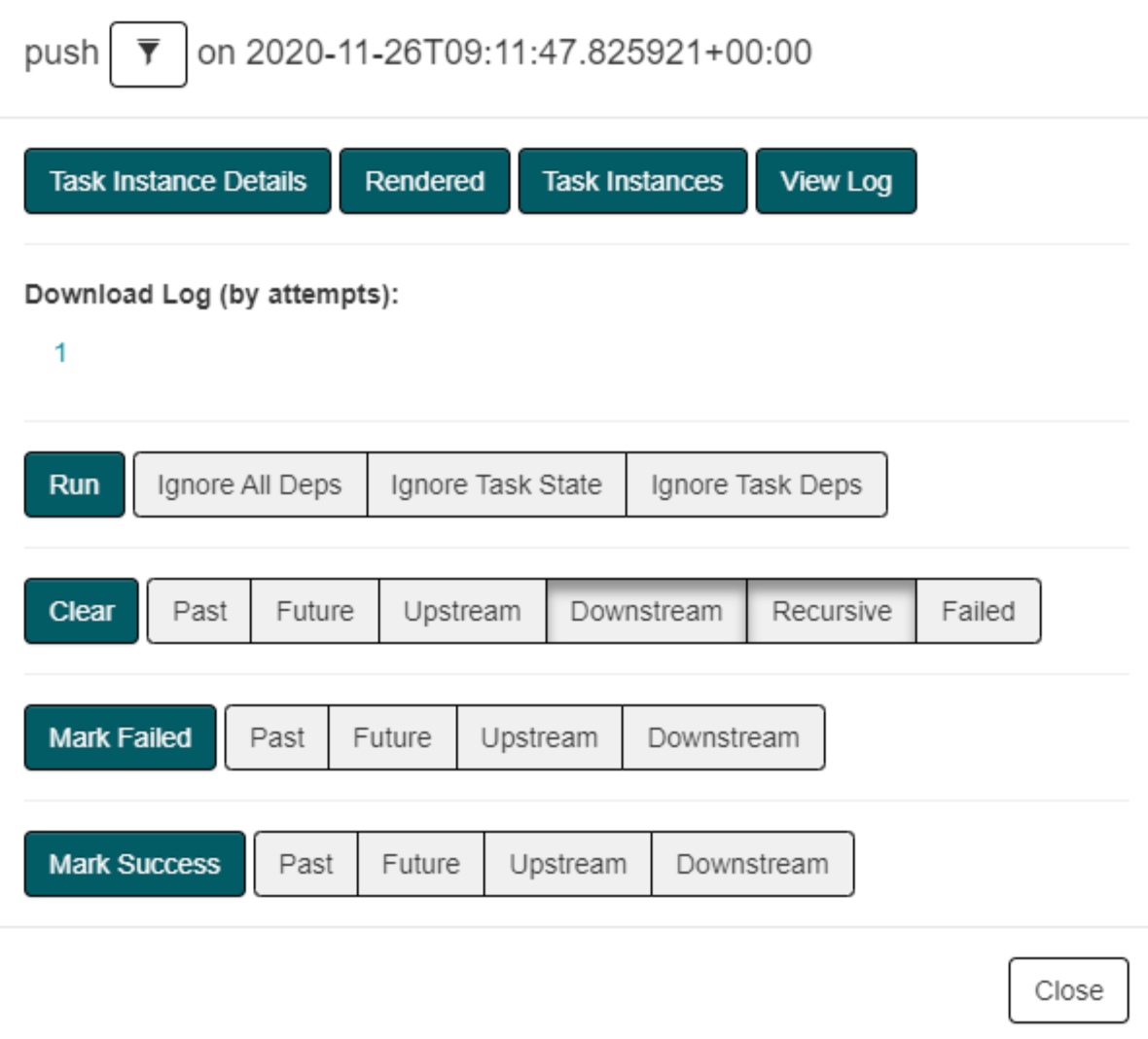 | Task instance | 각 Task의 개별 상태를 의미하며 ‘running’, ‘success’, ‘failed’, ‘skipped’, ‘up for retry’ 등의 상태값 보유 |