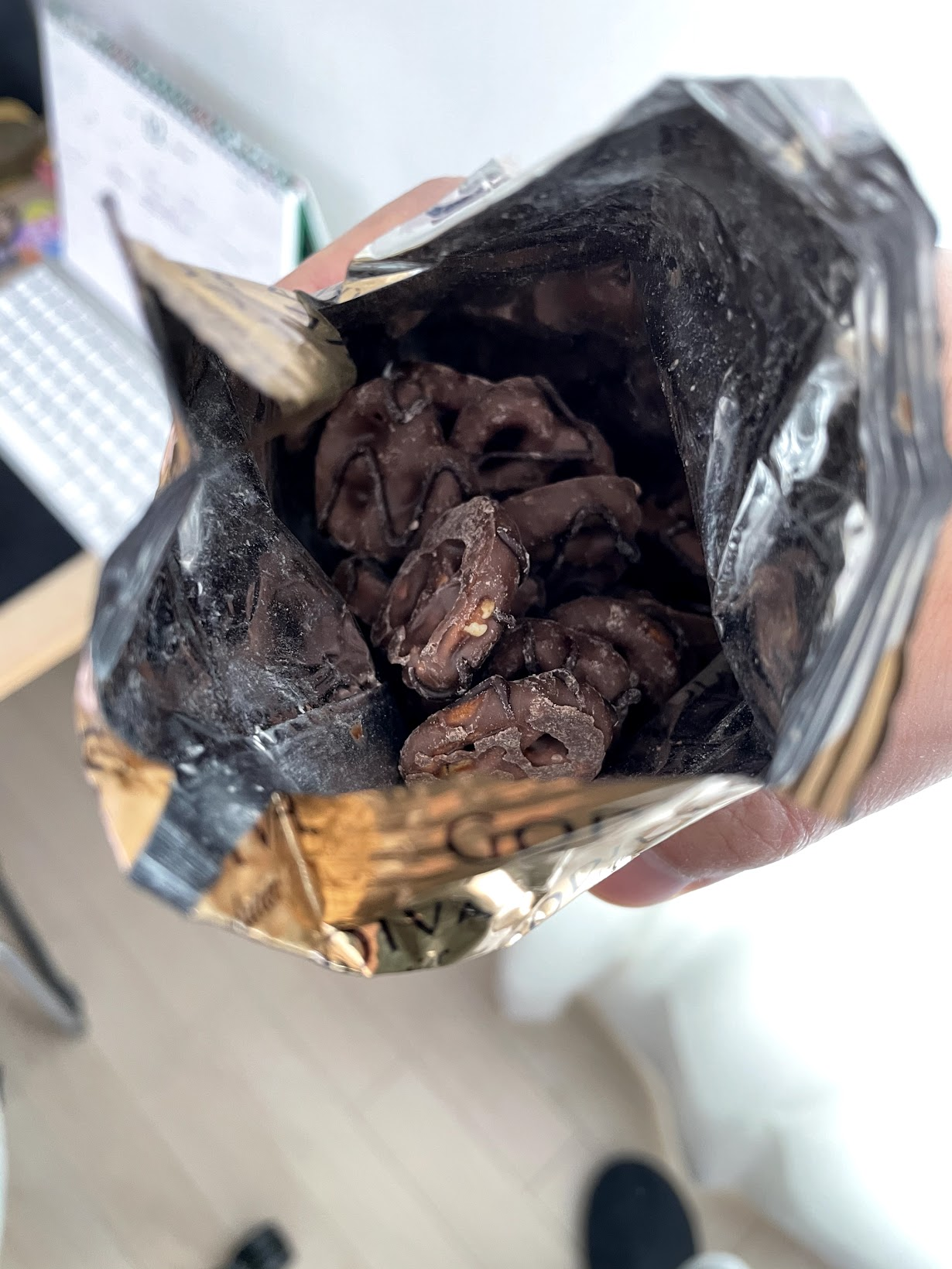 박스의 크기는 손바닥보다 작고 내용의 양은 국내 과자들 처럼 과대 포장되어 있지 않고 두툼하다. 맛은 프레첼에 초코가 묻어 있고 그 위에 약간의 소금이 더해진 맛이다. 그래서 단짠단짠 한데 단맛이 조금 더 강하다. 짠맛이 있어서 당연히 맥주에도 좋다. 다만 최애 상품이다 보니 약간 아껴서 먹게 되는 과자이다. 떨어질 때쯤 채워 넣고를 반복하며 아주 소중히 여기고 있다. 가격이 조금 부담되지만 직접 직구하지 말고 큐텐을 사용하여 더욱 싸게 구매하면 좋을 것 같다.