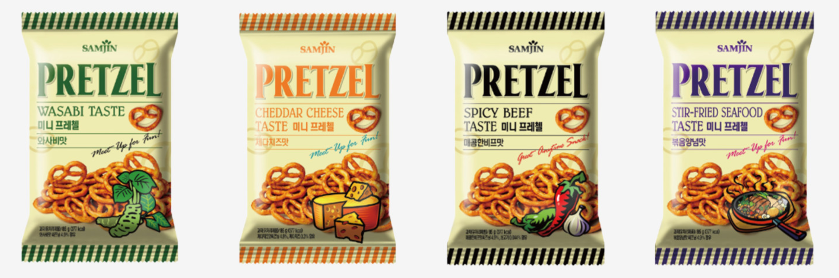 삼진 미니 프레첼은 프레첼 빵을 모습을 한 과자이다. 쫀득하지는 않지만 짭짤하다. 맛은 와사비, 체다치즈, 매콤한 비프, 볶음 양념 이렇게 4가지가 있다. 이 4가지 모두 인간 사료이다. 맥주 안주에 정말 더할 나위 없이 좋다. 크기도 85g이라서 하나 딱 열면 한방에 먹을 수 있는 크기이다. 심심할 때 하나씩 먹기도 좋고 저녁에 영화 한 편 보면서 맥주랑 함께 즐길 수 있는 최고의 간식이 아닐 수 없다.