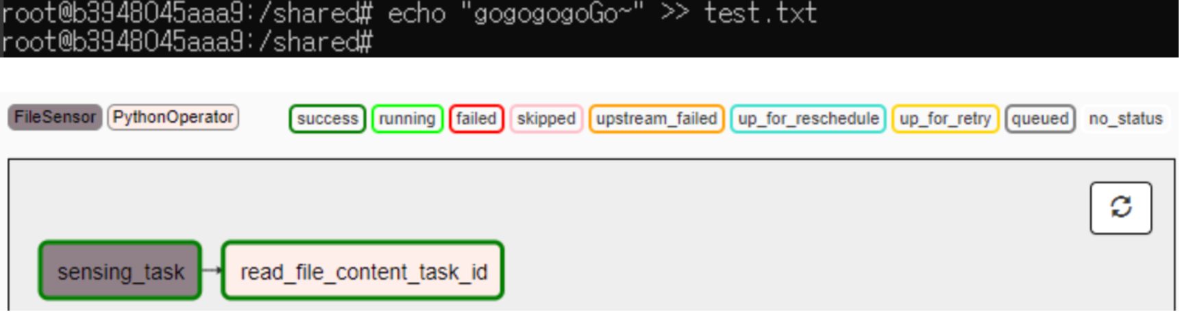 FileSensor는 신규 파일이 생성되었을 경우 해당 파일을 감지하여 Task 를 실행하거나 다음 Task로 이동시키는 Operator이다. 코드에서 특정 경로를 감지하고 있다가 개발자가 정의한 파일명이 생성될 경우, 자동으로 감지하여 다음 Dag로 이동한다. 코드에서는 /shared/test.txt 폴더를 감지하게 설정했다. 이후 시스템에 접근하여 touch로 파일을 생성했고 FileSensor는 생성된 파일을 감지한 후 dag(run_this)로 이동한다.