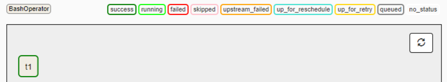 BashOperator는 bash 명령어를 사용할 수 있는 Operator이다. 간단하게 echo 명령어로 DAG를 만들어서 Airflow 공유 폴더(윈도우즈 : "C:/users/dorumugs/docker/airflow", 리눅스 : "/shared" )에 넣어주면 된다. Dag 안에는 여러 개의 task가 있는데 이 task 들을 task_id로 구분한다. 위 코드에서는 task_id를 "t1"으로 입력했고 아래 DAG를 보면 간단하게 t1 task를 확인할 수 있다.